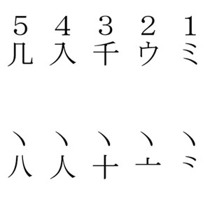 1. KATAKANA MI, TRIPLE TEN (trois points, le son « mi »)